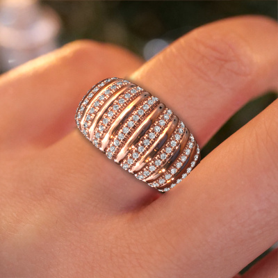 This is a stunning wide rose gold Dawn 12mm ring. It is set with lab grown diamond. A designer ring, fit for classy women. The ring is designed by our own expert goldsmiths. In our artisan studio, we use a combination of the latest techniques and ancient traditional craftsmanship, so we are able to create a perfectly designed ring. Our expert goldsmiths strive for perfection so they won't stop until a perfect ring, a true work of art, is created. A unique ring which matches your own style. The wide Dawn 12mm ring, as shown here, can be customized to your liking. Our online tool offers many different options but please feel free to contact us if you want changes made to your Dawn 12mm ring, which are unavailable in our online tool.By using a combination of the latest modern techniques, combined with ancient crafting, we can make all our rings in our own studio. Each jewel is made to order. This is advantageous because we can offer you a price you won't find anywhere else.To make it easier for you, we offer a 30 day return policy. Check our terms and conditions.