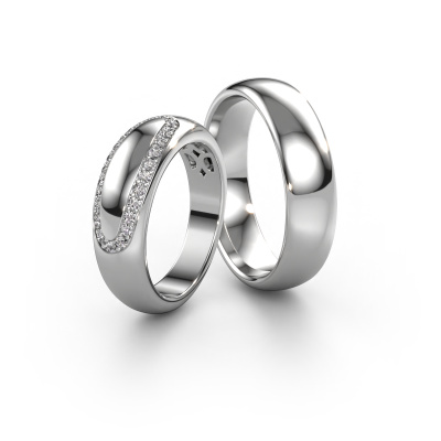 This WHR0039LM36BP set of white gold wedding rings consists of fantasy wedding rings that will surely make you shine on your wedding day. A beautiful symbol of your unique relationship. And that is why these fantasy wedding rings can be customized to your own liking. The women's wedding ring has a width of ±0.24 in and this specific ring is set with an exquisite diamond. We select the diamond with great care because your wedding rings have to be perfect in every way. The men's ring has a width of ±0.24 in. You can choose the combination of precious metals of your preference in our online tool. Anything goes! It is wise to browse through the characteristics of each different precious metal. For example, gold and silver are softer metals. Carat is determined by the amount of added extra metals. If the goldsmith doesn't add a lot, carat is higher and the wedding rings will be softer. If he adds more metals, the jewel has a lower amount of carat. A softer precious metal can still be used for your fantasy wedding rings! If you prefer a precious metal which will last a lifetime, we recommend platinum. This is the most solid and durable metal our goldsmith uses.After receiving your order, our goldsmiths will passionately start the creative process of making your wedding rings in our own artisan studio. Because we do not maintain a large stockpile, we can offer our jewellery at a lower price than other jewellers. Our pricing is proof of that! We offer top quality jewels at lowest price, guaranteed.To make it easier for you, we offer a 30 day return policy. Check our terms and conditions.