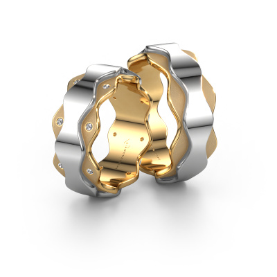 The combination of these two precious metals symbolizes the unity between two loved ones perfectly, don´t you agree? That is what makes this set of wavy WH2033LM17DP wedding rings perfect. The weddings ring is a symbol of your love, meant to be worn a lifetime! This set of wedding rings consists of unique two-tone wedding rings, that you can compile yourself in various precious metal combinations. This one has the combination of 14 Carat gold with white gold and they have a shiny finish. You will receive beautiful wedding rings, according to your own design, which our artisan goldsmith crafts in our own studio. The wedding band for men has a width of ±0.28 in, the women's ring has a width of ±0.28 in and this specific ring as shown here is set with diamond 0.12 crt. Because your wedding day must be adorned with nothing but the most beautiful gemstone. Wouldn't you agree?Simply customize your gemstones and colours with our online tool. Our jewel designers will make a 3D drawing of your design, so you can see the result. Our goldsmiths will subsequently make your wedding rings by hand, according ancient craftsmanship. Our goal is to make the wedding rings you have in mind. Unique wedding rings to match your style completely!After receiving your order, our goldsmiths will start the creative process of making your wedding rings. We don't keep stock. This is advantageous because these costs will not be passed on to you. Therefore, our quality wedding rings are always priced 30 percent lower than those of other jewellers.To make it easier for you, we offer a 30 day return policy. Check our terms and conditions.