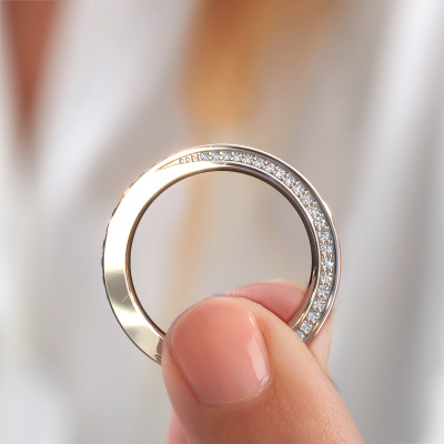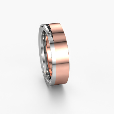 This design ladies wedding ring is a melting pot of ancient craftsmanship, love, passion and the latest techniques. It requires a keen eye, patience and a skilful hand to create this rose gold wedding ring to perfection. And perfection is what our goldsmiths strive for! This way, you create an exclusive ring, which is customized to your liking and made by hand in our own artisan studio. This design WH1002L15DP wedding ring is set with black diamond 0.42 crt, is ±0.24 in wide and has a shiny finish. You can choose the combination of precious metals of your preference in our online tool. Anything goes! It is wise to browse through the characteristics of each different precious metal. For example, gold and silver are softer metals. Carat is determined by the amount of added extra metals. If the goldsmith doesn't add a lot, carat is higher and the wedding ring will be softer. If he adds more metals, the jewel has a lower amount of carat. A softer precious metal can still be used for your design wedding ring! If you prefer a precious metal which will last a lifetime, we recommend platinum. This is the most solid and durable metal our goldsmith uses.Do you have special preferences regarding your wedding ring? For instance, a smaller or a wider band? Or perhaps a shiny or a matte ring? There are numerous variations possible. You can always discuss the possibilities with our jewellery designers. If you have certain wedding rings in mind, our designers will gladly help by drawing the rings of your dreams. Be sure to contact us!After receiving your order, our goldsmiths will start the creative process of making your wedding rings in our own crafting studio. We don't keep stock. This is advantageous because these costs will not be passed on to you. Therefore, we can offer the finest quality jewellery at exceptionally low prices.To make it easier for you, we offer a 30 day return policy. Check our terms and conditions.