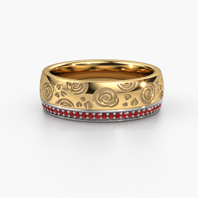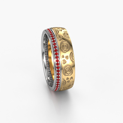 The design Eternity wedding ring is a ring with a beautiful symbolic meaning. Because there appears to be no beginning nor end to the row of ruby. A beautiful way of expressing your everlasting love. A ring to wear until the end of all time, as a symbol of your union. This special WH2066L27D ladies wedding ring has a width of ±0.28 in and is set with ruby 1 mm. You can choose the combination of precious metals of your preference in our online tool. Anything goes! It is wise to browse through the characteristics of each different precious metal. For example, gold and silver are softer metals. Carat is determined by the amount of added extra metals. If the goldsmith doesn't add a lot, carat is higher and the wedding ring will be softer. If he adds more metals, the jewel has a lower amount of carat. A softer precious metal can still be used for your design wedding ring! If you prefer a precious metal which will last a lifetime, we recommend platinum. This is the most solid and durable metal our goldsmith uses.By the way, you can be inspired by this wedding ring and have it further adjusted to your taste. Do you prefer a smaller band or a wider one? Do you prefer a shiny ring or a matte one? Anything is possible. Also, if you have an idea of your own for extraordinary wedding rings, or if you have seen a beautiful set somewhere else that you really like and would like to have adjusted to your personal taste: no problem! don't hesitate to contact us. Our designers will gladly discuss your possibilities with you!After receiving your order, our goldsmiths will passionately start the creative process of making your wedding rings in our own artisan studio. Because we do not maintain a large stockpile, we can offer our jewellery at a lower price than other jewellers. Our pricing is proof of that! We offer top quality jewels at lowest price, guaranteed.To make it easier for you, we offer a 30 day return policy. Check our terms and conditions.