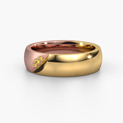 A truly stylish 14 Carat modern wedding ring! This exquisite ladies wedding ring, as shown above, is set with round yellow sapphire. Our goldsmiths make each rose gold wedding ring by hand in our own artisan studio and because of that, the yellow sapphire are set with the utmost precision. This causes light to reflect evenly from every angle of the yellow sapphire. The width of this modern WH2007L wedding ring is ±0.24 in and the finish is mat/shiny. The jewel designer, member of a specialized team, will make a graphic 3D design of your wedding ring. If it pleases you, you can also order a ring dummy so you can try it on and see your ring before creation. Subsequently, our goldsmith will create your unique wedding ring with great care in our own crafting studio. A meticulous job, because both creating as well as finishing your ring requires a keen eye. And that is what makes our craft special. Your unique wedding ring is the result of true passionate craftsmanship!This wedding ring can also serve as a source of inspiration. Would you like the ring to have a matte or shiny finish (at no additional cost), or would you prefer it to be wider or narrower? Anything is possible. Because there are countless variations, we can’t show everything on our website. Do you have an idea for beautiful wedding rings, or have you seen a stunning set of wedding rings elsewhere? Feel free to contact us; our designers are ready to assist you.After receiving your order, our goldsmiths will start the creative process of making your wedding rings in our own crafting studio. We don't keep stock. This is advantageous because these costs will not be passed on to you. Therefore, we can offer the finest quality jewellery at exceptionally low prices.To make it easier for you, we offer a 30 day return policy. Check our terms and conditions.