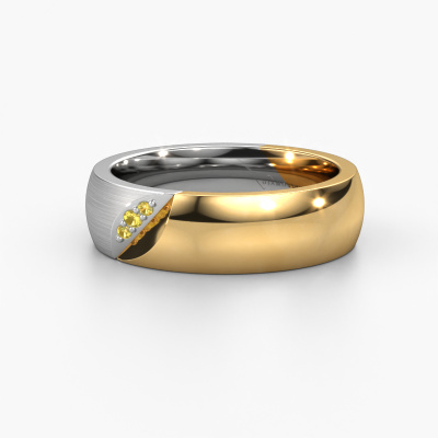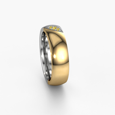 A truly stylish 14 Carat modern wedding ring! This exquisite ladies wedding ring, as shown above, is set with round yellow sapphire. Our goldsmiths make each white gold wedding ring by hand in our own artisan studio and because of that, the yellow sapphire are set with the utmost precision. This causes light to reflect evenly from every angle of the yellow sapphire. The width of this modern WH2007L wedding ring is ±0.24 in and the finish is mat/shiny. The jewel designer, member of a specialized team, will make a graphic 3D design of your wedding ring. If it pleases you, you can also order a ring dummy so you can try it on and see your ring before creation. Subsequently, our goldsmith will create your unique wedding ring with great care in our own crafting studio. A meticulous job, because both creating as well as finishing your ring requires a keen eye. And that is what makes our craft special. Your unique wedding ring is the result of true passionate craftsmanship!This wedding ring can also serve as a source of inspiration. Would you like the ring to have a matte or shiny finish (at no additional cost), or would you prefer it to be wider or narrower? Anything is possible. Because there are countless variations, we can’t show everything on our website. Do you have an idea for beautiful wedding rings, or have you seen a stunning set of wedding rings elsewhere? Feel free to contact us; our designers are ready to assist you.After receiving your order, our goldsmiths will start the creative process of making your wedding rings in our own crafting studio. We don't keep stock. This is advantageous because these costs will not be passed on to you. Therefore, we can offer the finest quality jewellery at exceptionally low prices.To make it easier for you, we offer a 30 day return policy. Check our terms and conditions.
