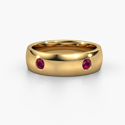 A truly stylish 14 Carat exclusive wedding ring! This exquisite ladies wedding ring, as shown above, is set with round rhodolite. Our goldsmiths make each gold wedding ring by hand in our own artisan studio and because of that, the rhodolite are set with the utmost precision. This causes light to reflect evenly from every angle of the rhodolite. The width of this exclusive WH0104L26BP wedding ring is ±0.24 in and the finish is shiny. Gold represents love and therefore our goldsmith loves using it in the design of your exclusive wedding ring. We are a proud member of the Responsible Jewellery Council. This means we only use eco-friendly gold. Something we take great pride in, obviously. It is also possible to use your own gold in the design of your wedding ring. Each jewel is made by hand in our own artisan studio so we can offer this option. This gives you the opportunity to add an extra personal touch to your ring. A ring with its own history!By the way, you can be inspired by this wedding ring and have it further adjusted to your taste. Do you prefer a smaller band or a wider one? Do you prefer a shiny ring or a matte one? Anything is possible. Also, if you have an idea of your own for extraordinary wedding rings, or if you have seen a beautiful set somewhere else that you really like and would like to have adjusted to your personal taste: no problem! don't hesitate to contact us. Our designers will gladly discuss your possibilities with you!Because we design our wedding rings ourselves, and deliver it directly to you, we can offer you wedding rings at a price you won't find anywhere else. Our rings are made to order, which helps prevent excess supplies, so we can make you a great price offer.To make it easier for you, we offer a 30 day return policy. Check our terms and conditions.
