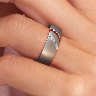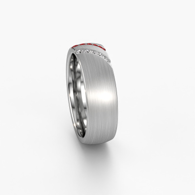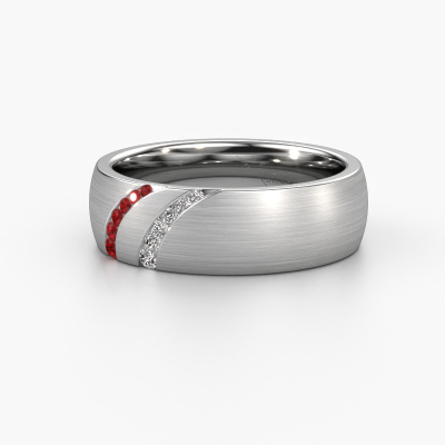 To create your ladies wedding ring in our artisan studio, we use the most modern techniques, combined with ancient craftsmanship. The end result is this modern WH2015L wedding ring, which is crafted to perfection by hand by our goldsmiths. A ring that fills us with pride. This white gold WH2015L ladies wedding ring with court profile has an ±0.26 in width and has a matte finish with ruby. You can choose the combination of precious metals of your preference in our online tool. Anything goes! It is wise to browse through the characteristics of each different precious metal. For example, gold and silver are softer metals. Carat is determined by the amount of added extra metals. If the goldsmith doesn't add a lot, carat is higher and the wedding ring will be softer. If he adds more metals, the jewel has a lower amount of carat. A softer precious metal can still be used for your modern wedding ring! If you prefer a precious metal which will last a lifetime, we recommend platinum. This is the most solid and durable metal our goldsmith uses.Do you have specific wishes regarding your wedding ring, but are you having difficulties finding the design on our website? The be sure to contact our designers! For instance, we can make the band smaller or wider. Do you prefer a matte finish? We can do that! Engravings are a great way of personalizing your rings, and applicable on most designs. Or, if you have an idea of your own for your extraordinary wedding rings, contact us! Our designers are up for the challenge of designing the ring of your dreams!After receiving your order, our goldsmiths will passionately start the creative process of making your wedding rings in our own artisan studio. Because we do not maintain a large stockpile, we can offer our jewellery at a lower price than other jewellers. Our pricing is proof of that! We offer top quality jewels at lowest price, guaranteed.To make it easier for you, we offer a 30 day return policy. Check our terms and conditions.