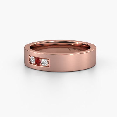 To create your ladies wedding ring in our artisan studio, we use the most modern techniques, combined with ancient craftsmanship. The end result is this modern WH0110L15BM wedding ring, which is crafted to perfection by hand by our goldsmiths. A ring that fills us with pride. This rose gold WH0110L15BM ladies wedding ring with flat profile has an ±0.20 in width and has a mat/shiny finish with ruby. You can choose the combination of precious metals of your preference in our online tool. Anything goes! It is wise to browse through the characteristics of each different precious metal. For example, gold and silver are softer metals. Carat is determined by the amount of added extra metals. If the goldsmith doesn't add a lot, carat is higher and the wedding ring will be softer. If he adds more metals, the jewel has a lower amount of carat. A softer precious metal can still be used for your modern wedding ring! If you prefer a precious metal which will last a lifetime, we recommend platinum. This is the most solid and durable metal our goldsmith uses.This wedding ring can also serve as a source of inspiration. Would you like the ring to have a matte or shiny finish (at no additional cost), or would you prefer it to be wider or narrower? Anything is possible. Because there are countless variations, we can’t show everything on our website. Do you have an idea for beautiful wedding rings, or have you seen a stunning set of wedding rings elsewhere? Feel free to contact us; our designers are ready to assist you.By combining our modern techniques with ancient crafting, we can design and customize the finest quality jewels with the utmost care for you at the best price. Our wedding rings are always priced 30% lower than those of other jewellers. We make wedding rings to order so we don't have to maintain a large stock.To make it easier for you, we offer a 30 day return policy. Check our terms and conditions.