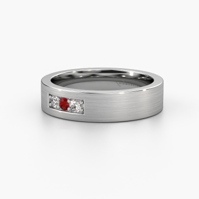 To create your ladies wedding ring in our artisan studio, we use the most modern techniques, combined with ancient craftsmanship. The end result is this modern WH0110L15BM wedding ring, which is crafted to perfection by hand by our goldsmiths. A ring that fills us with pride. This white gold WH0110L15BM ladies wedding ring with flat profile has an ±0.20 in width and has a mat/shiny finish with ruby. You can choose the combination of precious metals of your preference in our online tool. Anything goes! It is wise to browse through the characteristics of each different precious metal. For example, gold and silver are softer metals. Carat is determined by the amount of added extra metals. If the goldsmith doesn't add a lot, carat is higher and the wedding ring will be softer. If he adds more metals, the jewel has a lower amount of carat. A softer precious metal can still be used for your modern wedding ring! If you prefer a precious metal which will last a lifetime, we recommend platinum. This is the most solid and durable metal our goldsmith uses.This wedding ring can also serve as a source of inspiration. Would you like the ring to have a matte or shiny finish (at no additional cost), or would you prefer it to be wider or narrower? Anything is possible. Because there are countless variations, we can’t show everything on our website. Do you have an idea for beautiful wedding rings, or have you seen a stunning set of wedding rings elsewhere? Feel free to contact us; our designers are ready to assist you.By combining our modern techniques with ancient crafting, we can design and customize the finest quality jewels with the utmost care for you at the best price. Our wedding rings are always priced 30% lower than those of other jewellers. We make wedding rings to order so we don't have to maintain a large stock.To make it easier for you, we offer a 30 day return policy. Check our terms and conditions.