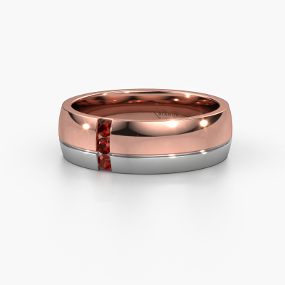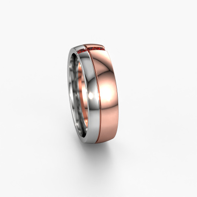 A unique two-tone rose gold ladies wedding ring, designed by you, and then artfully crafted by our goldsmith in our own artisan studio! A beautiful symbol, reflecting your love, which you carry with you for a lifetime! Each ring we offer is artfully forged by hand in our own crafting studio. This makes it possible for us to create you a ring which is customized to your liking, completely shiny your style. This modern WH0223L56A wedding ring is set with garnet, is ±0.24 in wide and has a shiny finish. The jewel designer, member of a specialized team, will make a graphic 3D design of your wedding ring. If it pleases you, you can also order a ring dummy so you can try it on and see your ring before creation. Subsequently, our goldsmith will create your unique wedding ring with great care in our own crafting studio. A meticulous job, because both creating as well as finishing your ring requires a keen eye. And that is what makes our craft special. Your unique wedding ring is the result of true passionate craftsmanship!By the way, you can be inspired by this wedding ring and have it further adjusted to your taste. Do you prefer a smaller band or a wider one? Do you prefer a shiny ring or a matte one? Anything is possible. Also, if you have an idea of your own for extraordinary wedding rings, or if you have seen a beautiful set somewhere else that you really like and would like to have adjusted to your personal taste: no problem! don't hesitate to contact us. Our designers will gladly discuss your possibilities with you!After receiving your order, our goldsmiths will start the creative process of making your wedding rings. We don't keep stock. This is advantageous because these costs will not be passed on to you. Therefore, our quality wedding rings are always priced 30 percent lower than those of other jewellers.To make it easier for you, we offer a 30 day return policy. Check our terms and conditions.