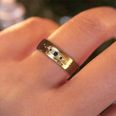 This modern ladies wedding ring is a stunning, contemporary wedding ring which truly symbolizes your unique love! Perfectly suited for men with a contemporary style. Simply customize the ring to your liking. Our goldsmith would take on any challenge of creating a perfect ring and will work on your ring, designed by you, in our own artisan studio. He will carefully and passionately create your WH0133L25AP ±0.20x0.07 in wedding ring by hand whilst using the most modern techniques, combined with pure craftsmanship. And this results in a unique, contemporary ring! This modern WH0133L25AP wedding ring is set with round black diamond is ±0.20 in wide and has a shiny finish. The jewel designer, member of a specialized team, will make a graphic 3D design of your wedding ring. If it pleases you, you can also order a ring dummy so you can try it on and see your ring before creation. Subsequently, our goldsmith will create your unique wedding ring with great care in our own crafting studio. A meticulous job, because both creating as well as finishing your ring requires a keen eye. And that is what makes our craft special. Your unique wedding ring is the result of true passionate craftsmanship!Be inspired by our designs, and adjust this wedding ring to your own personal taste: wider or smaller, shiny or matte? No problem! Even if you have ideas of your own for special wedding rings, our jewellery designers are lined up to help you design the ring of your dreams. don't hesitate to contact us!By combining our modern techniques with ancient crafting, we can design and customize the finest quality jewels with the utmost care for you at the best price. Our wedding rings are always priced 30% lower than those of other jewellers. We make wedding rings to order so we don't have to maintain a large stock.To make it easier for you, we offer a 30 day return policy. Check our terms and conditions.