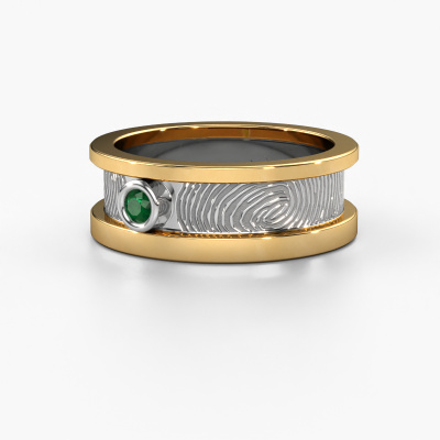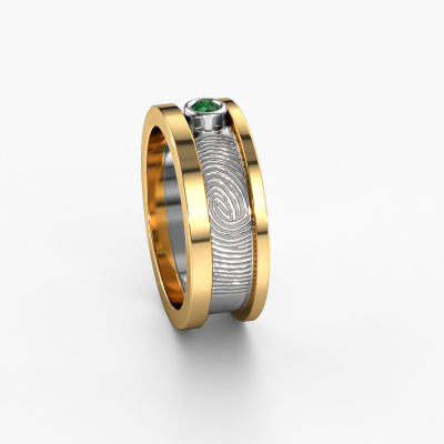 What could be more unique than a fingerprint? That makes this ladies wedding ring with emerald special. A personal fingerprint of your loved one, engraved tot the symbol of your everlasting love. Wouldn't it be lovely to slide this fantasy wedding ring around the finger of your partner on your wedding day? How does it work? First you order the wedding ring after customizing it to your liking. Once your order is placed, you send us an e-mail with the fingerprint you would like to use. For further instructions on how to make a fingerprint, check our database at the bottom of this page. This Francisca wedding ring has an ±0.28 in width. After ordering your wedding ring, our goldsmith will start creating your wedding ring immediately. Did you know we use the latest modern techniques, combined with ancient craftsmanship? This helps to create a 3D design of your jewel. You can order a dummy ring, if you please. This way you can check if the wedding ring meets your standard. Then, our goldsmith, who strives for perfection, will create your ring in our own artisan studio completely by hand. We feel passionate creating a unique ring each time. One which is finished to perfection. In the end, you get a wedding ring which matches your wishes.By the way, you can be inspired by this wedding ring and have it further adjusted to your taste. Do you prefer a smaller band or a wider one? Do you prefer a shiny ring or a matte one? Anything is possible. Also, if you have an idea of your own for extraordinary wedding rings, or if you have seen a beautiful set somewhere else that you really like and would like to have adjusted to your personal taste: no problem! don't hesitate to contact us. Our designers will gladly discuss your possibilities with you!After receiving your order, our goldsmiths will start the creative process of making your wedding rings. We don't keep stock. This is advantageous because these costs will not be passed on to you. Therefore, our quality wedding rings are always priced 30 percent lower than those of other jewellers.To make it easier for you, we offer a 30 day return policy. Check our terms and conditions.