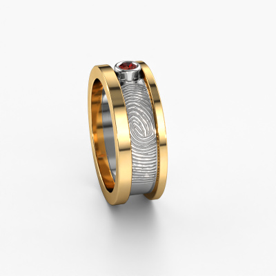 What could be more unique than a fingerprint? That makes this ladies wedding ring with garnet special. A personal fingerprint of your loved one, engraved tot the symbol of your everlasting love. Wouldn't it be lovely to slide this fantasy wedding ring around the finger of your partner on your wedding day? How does it work? First you order the wedding ring after customizing it to your liking. Once your order is placed, you send us an e-mail with the fingerprint you would like to use. For further instructions on how to make a fingerprint, check our database at the bottom of this page. This Francisca wedding ring has an ±0.28 in width. After ordering your wedding ring, our goldsmith will start creating your wedding ring immediately. Did you know we use the latest modern techniques, combined with ancient craftsmanship? This helps to create a 3D design of your jewel. You can order a dummy ring, if you please. This way you can check if the wedding ring meets your standard. Then, our goldsmith, who strives for perfection, will create your ring in our own artisan studio completely by hand. We feel passionate creating a unique ring each time. One which is finished to perfection. In the end, you get a wedding ring which matches your wishes.By the way, you can be inspired by this wedding ring and have it further adjusted to your taste. Do you prefer a smaller band or a wider one? Do you prefer a shiny ring or a matte one? Anything is possible. Also, if you have an idea of your own for extraordinary wedding rings, or if you have seen a beautiful set somewhere else that you really like and would like to have adjusted to your personal taste: no problem! don't hesitate to contact us. Our designers will gladly discuss your possibilities with you!After receiving your order, our goldsmiths will start the creative process of making your wedding rings. We don't keep stock. This is advantageous because these costs will not be passed on to you. Therefore, our quality wedding rings are always priced 30 percent lower than those of other jewellers.To make it easier for you, we offer a 30 day return policy. Check our terms and conditions.