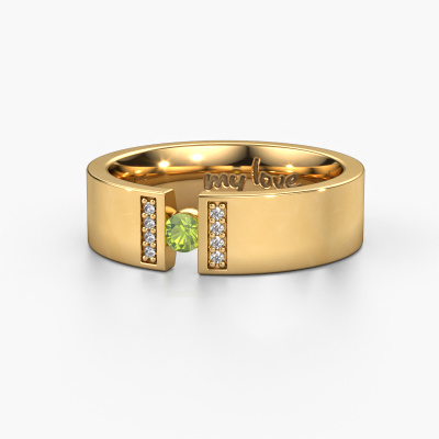 A unique wedding ring with peridot! What makes this ladies wedding ring WH2096L16C special, is that you can have it engraved with a special text, which has meaning to you. A word, a short phrase or part of the lyrics to a song. Whichever text is most meaningful to you. Memorialize it as an exquisite engravement on this modern wedding ring. This own Text ladies wedding ring has an ±0.24 in width. Simply customize your gemstones and colours with our online tool. Our jewel designers will make a 3D drawing of your design, so you can see the result. Our goldsmiths will subsequently make your wedding ring by hand, according ancient craftsmanship. Our goal is to make the wedding ring you have in mind. A unique wedding ring to match your style completely!This wedding ring can also serve as a source of inspiration. Would you like the ring to have a matte or shiny finish (at no additional cost), or would you prefer it to be wider or narrower? Anything is possible. Because there are countless variations, we can’t show everything on our website. Do you have an idea for beautiful wedding rings, or have you seen a stunning set of wedding rings elsewhere? Feel free to contact us; our designers are ready to assist you.After receiving your order, our goldsmiths will start the creative process of making your wedding rings. We don't keep stock. This is advantageous because these costs will not be passed on to you. Therefore, our quality wedding rings are always priced 30 percent lower than those of other jewellers.To make it easier for you, we offer a 30 day return policy. Check our terms and conditions.