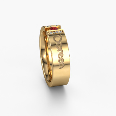 A unique wedding ring with ruby! What makes this ladies wedding ring WH2094L16C special, is that you can have it engraved with a special text, which has meaning to you. A word, a short phrase or part of the lyrics to a song. Whichever text is most meaningful to you. Memorialize it as an exquisite engravement on this modern wedding ring. This own Text ladies wedding ring has an ±0.24 in width. You can choose the combination of precious metals of your preference in our online tool. Anything goes! It is wise to browse through the characteristics of each different precious metal. For example, gold and silver are softer metals. Carat is determined by the amount of added extra metals. If the goldsmith doesn't add a lot, carat is higher and the wedding ring will be softer. If he adds more metals, the jewel has a lower amount of carat. A softer precious metal can still be used for your modern wedding ring! If you prefer a precious metal which will last a lifetime, we recommend platinum. This is the most solid and durable metal our goldsmith uses.This wedding ring can also serve as a source of inspiration. Would you like the ring to have a matte or shiny finish (at no additional cost), or would you prefer it to be wider or narrower? Anything is possible. Because there are countless variations, we can’t show everything on our website. Do you have an idea for beautiful wedding rings, or have you seen a stunning set of wedding rings elsewhere? Feel free to contact us; our designers are ready to assist you.By combining our modern techniques with ancient crafting, we can design and customize the finest quality jewels with the utmost care for you at the best price. Our wedding rings are always priced 30% lower than those of other jewellers. We make wedding rings to order so we don't have to maintain a large stock.To make it easier for you, we offer a 30 day return policy. Check our terms and conditions.