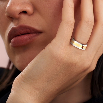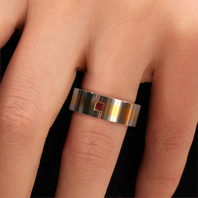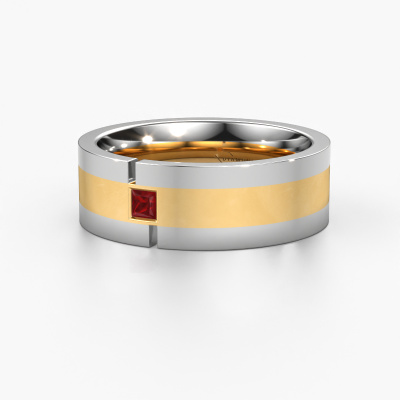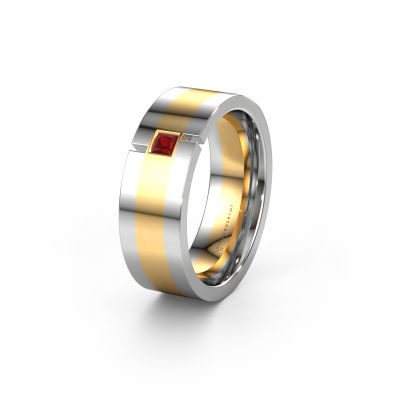 An extraordinary 2 colour ladies wedding ring! As unique as your relationship! No two people are alike and that is why you want a unique wedding ring. This exclusive WH2042P wedding ring is made by our jewel designers and crafted by hand by our goldsmith. In that process, We use pure craftsmanship combined with the latest techniques to achieve the best result. Our goldsmith strives for absolute perfection. A unique, handmade wedding ring, made to memorialize your big day! This exclusive WH2042P wedding ring is set with ruby, is ±0.28 in wide and has a shiny finish. The jewel designer, member of a specialized team, will make a graphic 3D design of your wedding ring. If it pleases you, you can also order a ring dummy so you can try it on and see your ring before creation. Subsequently, our goldsmith will create your unique wedding ring with great care in our own crafting studio. A meticulous job, because both creating as well as finishing your ring requires a keen eye. And that is what makes our craft special. Your unique wedding ring is the result of true passionate craftsmanship!Do you have specific wishes? Like a shiny ring, or a matte one? A wider band, or a smaller one? The possibilities of this wedding ring are endless. Be sure to contact our designers to adjust your ring to your personal taste. Did you see a ring somewhere, or do you have some special ideas of your own? Then don't hesitate to contact our designers and discuss your ideas for your own set of beautiful wedding rings. We are up for the challenge of creating the ring exactly the way you want it!After receiving your order, our goldsmiths will start the creative process of making your wedding rings. We don't keep stock. This is advantageous because these costs will not be passed on to you. Therefore, our quality wedding rings are always priced 30 percent lower than those of other jewellers.To make it easier for you, we offer a 30 day return policy. Check our terms and conditions.