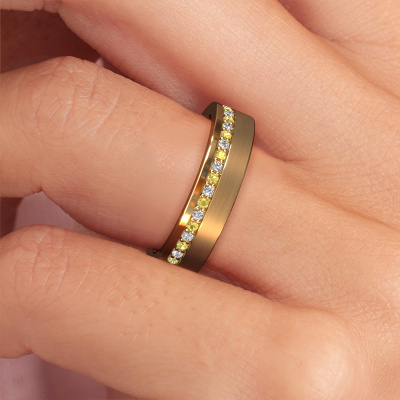 Did you know the Eternity wedding ring not only looks good, but that this wedding ring also has its own beautiful symbolical meaning? The Eternity wedding ring, with perfectly aligned smaller sized gemstones, represents your eternal love. Because the ring is pave set with gemstones, it appears to have no beginning nor end. Beautiful, wouldn't you agree? This special WH0303L15BPM ladies wedding ring has a width of ±0.20 in and is set with yellow sapphire 1.3 mm. The jewel designer, member of a specialized team, will make a graphic 3D design of your wedding ring. If it pleases you, you can also order a ring dummy so you can try it on and see your ring before creation. Subsequently, our goldsmith will create your unique wedding ring with great care in our own crafting studio. A meticulous job, because both creating as well as finishing your ring requires a keen eye. And that is what makes our craft special. Your unique wedding ring is the result of true passionate craftsmanship!This wedding ring can also serve as a source of inspiration. Would you like the ring to have a matte or shiny finish (at no additional cost), or would you prefer it to be wider or narrower? Anything is possible. Because there are countless variations, we can’t show everything on our website. Do you have an idea for beautiful wedding rings, or have you seen a stunning set of wedding rings elsewhere? Feel free to contact us; our designers are ready to assist you.Because we design and deliver our own wedding rings, we can offer you wedding rings at a price you won't find anywhere else. A ring is made to order, which helps prevent excess supplies, so we can make you a great price offer.To make it easier for you, we offer a 30 day return policy. Check our terms and conditions.