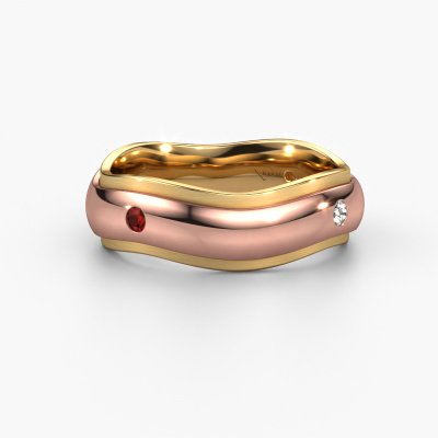 What a perfect combination of two different precious metals. They seem to reinforce each other in the unique design of this ring! Our goldsmith would be honoured to create a unique ring for you, customized to your liking. Each ladies wedding ring we offer is artfully crafted by hand in our own artisan studio. That makes it possible for us to turn unique into reality and helps create your own personal ring, customized to your style. This unique WH2050L26DP ladies wedding ring is set with round garnet, is ±0.24 in wide and has a shiny finish. After designing your ring, our jewel designer will start working on it. He will make a graphic 3D design of your wedding ring. This can also be used to make a dummy ring. Simply order a dummy ring and see for yourself how your ring will turn out. Subsequently, our expert goldsmith will create your ring in our own artisan studio. We use eco-friendly gold, so you get a ring, we are proud of, which looks good inside and out. You can also send us your own gold. Because we create your ring by hand, we can use your own gold. Our goal is to create an exquisite sparkling wedding ring just as envisioned it!Do you have specific wishes regarding your wedding ring, but are you having difficulties finding the design on our website? The be sure to contact our designers! For instance, we can make the band smaller or wider. Do you prefer a matte finish? We can do that! Engravings are a great way of personalizing your rings, and applicable on most designs. Or, if you have an idea of your own for your extraordinary wedding rings, contact us! Our designers are up for the challenge of designing the ring of your dreams!After receiving your order, our goldsmiths will start the creative process of making your wedding rings. We don't keep stock. This is advantageous because these costs will not be passed on to you. Therefore, our quality wedding rings are always priced 30 percent lower than those of other jewellers.To make it easier for you, we offer a 30 day return policy. Check our terms and conditions.