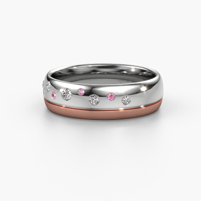 A unique ladies wedding ring, especially designed by our own jewel designers. An unusual ring that matches each style. This fantasy wedding ring WH0317L36AP is made by hand by our goldsmiths in our own crafting studio. By using a combination of the most modern techniques and ancient craftsmanship, your WH0317L36AP ring is created to perfection. This ladies wedding ring has an ±0.24 in width and has a shiny finish. Here, the fantasy white gold wedding ring is shown in the combination white gold with rose gold. An exquisite wedding ring, a celebration of your wedding day!You can choose the combination of precious metals of your preference in our online tool. Anything goes! It is wise to browse through the characteristics of each different precious metal. For example, gold and silver are softer metals. Carat is determined by the amount of added extra metals. If the goldsmith doesn't add a lot, carat is higher and the wedding ring will be softer. If he adds more metals, the jewel has a lower amount of carat. A softer precious metal can still be used for your fantasy wedding ring! If you prefer a precious metal which will last a lifetime, we recommend platinum. This is the most solid and durable metal our goldsmith uses.Be inspired by our designs, and adjust this wedding ring to your own personal taste: wider or smaller, shiny or matte? No problem! Even if you have ideas of your own for special wedding rings, our jewellery designers are lined up to help you design the ring of your dreams. don't hesitate to contact us!After receiving your order, our goldsmiths will start the creative process of making your wedding rings. We don't keep stock. This is advantageous because these costs will not be passed on to you. Therefore, our quality wedding rings are always priced 30 percent lower than those of other jewellers.To make it easier for you, we offer a 30 day return policy. Check our terms and conditions.