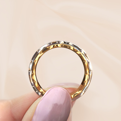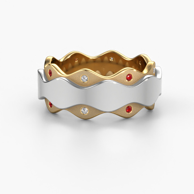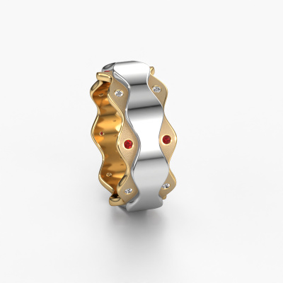 A unique ladies wedding ring, especially designed by our own jewel designers. An unusual ring that matches each style. This fantasy wedding ring WH2033L is made by hand by our goldsmiths in our own crafting studio. By using a combination of the most modern techniques and ancient craftsmanship, your WH2033L ring is created to perfection. This ladies wedding ring has an ±0.28 in width and has a mat/shiny finish. Here, the fantasy gold wedding ring is shown in the combination gold with white gold. An exquisite wedding ring, a celebration of your wedding day!Choosing a wedding ring is not done on a whim. In the end, you want a ring that completely matches your style and preferences. A reflection of your love and relationship. A ring to last a lifetime. A symbol of all that unites you. Creating your dream ring is what gets us excited. This is artfully done by hand in our own crafting studio, so we can create your ring to perfection. The most rewarding job in the world!Do you have specific wishes regarding your wedding ring, but are you having difficulties finding the design on our website? The be sure to contact our designers! For instance, we can make the band smaller or wider. Do you prefer a matte finish? We can do that! Engravings are a great way of personalizing your rings, and applicable on most designs. Or, if you have an idea of your own for your extraordinary wedding rings, contact us! Our designers are up for the challenge of designing the ring of your dreams!After receiving your order, our goldsmiths will start the creative process of making your wedding rings. We don't keep stock. This is advantageous because these costs will not be passed on to you. Therefore, our quality wedding rings are always priced 30 percent lower than those of other jewellers.To make it easier for you, we offer a 30 day return policy. Check our terms and conditions.