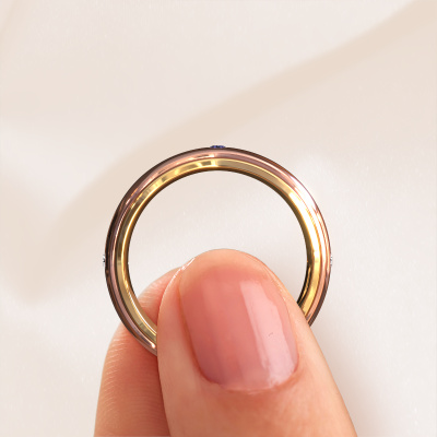 What a perfect combination of two different precious metals. They seem to reinforce each other in the unique design of this ring! Our goldsmith would be honoured to create a unique ring for you, customized to your liking. Each ladies wedding ring we offer is artfully crafted by hand in our own artisan studio. That makes it possible for us to turn unique into reality and helps create your own personal ring, customized to your style. This unique WH2050L26DP ladies wedding ring is set with round sapphire, is ±0.24 in wide and has a shiny finish. After designing your ring, our jewel designer will start working on it. He will make a graphic 3D design of your wedding ring. This can also be used to make a dummy ring. Simply order a dummy ring and see for yourself how your ring will turn out. Subsequently, our expert goldsmith will create your ring in our own artisan studio. We use eco-friendly gold, so you get a ring, we are proud of, which looks good inside and out. You can also send us your own gold. Because we create your ring by hand, we can use your own gold. Our goal is to create an exquisite sparkling wedding ring just as envisioned it!Do you have specific wishes regarding your wedding ring, but are you having difficulties finding the design on our website? The be sure to contact our designers! For instance, we can make the band smaller or wider. Do you prefer a matte finish? We can do that! Engravings are a great way of personalizing your rings, and applicable on most designs. Or, if you have an idea of your own for your extraordinary wedding rings, contact us! Our designers are up for the challenge of designing the ring of your dreams!After receiving your order, our goldsmiths will start the creative process of making your wedding rings. We don't keep stock. This is advantageous because these costs will not be passed on to you. Therefore, our quality wedding rings are always priced 30 percent lower than those of other jewellers.To make it easier for you, we offer a 30 day return policy. Check our terms and conditions.