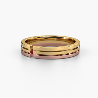 An extraordinary affordable gold ladies wedding ring! The combination of the three different precious metals represents your unique love. Isn't that wonderful? Our goldsmith will create your ring in our own crafting studio. With a unique combination of pure craftsmanship of goldsmiths and the most modern techniques, we are able to customize your modern three tone wedding ring to perfection. This 3 colour WH0402L14AM wedding ring set with round ruby is ±0.16 in wide and has a matte finish. Choosing a wedding ring is not done on a whim. In the end, you want a ring that completely matches your style and preferences. A reflection of your love and relationship. A ring to last a lifetime. A symbol of all that unites you. Creating your dream ring is what gets us excited. This is artfully done by hand in our own crafting studio, so we can create your ring to perfection. The most rewarding job in the world!Do you have specific wishes regarding your wedding ring, but are you having difficulties finding the design on our website? The be sure to contact our designers! For instance, we can make the band smaller or wider. Do you prefer a matte finish? We can do that! Engravings are a great way of personalizing your rings, and applicable on most designs. Or, if you have an idea of your own for your extraordinary wedding rings, contact us! Our designers are up for the challenge of designing the ring of your dreams!By combining our modern techniques with ancient crafting, we can design and customize the finest quality jewels with the utmost care for you at the best price. Our wedding rings are always priced 30% lower than those of other jewellers. We make wedding rings to order so we don't have to maintain a large stock.To make it easier for you, we offer a 30 day return policy. Check our terms and conditions.