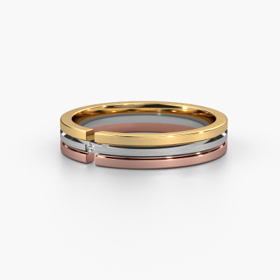 An extraordinary affordable white gold ladies wedding ring! The combination of the three different precious metals represents your unique love. Isn't that wonderful? Our goldsmith will create your ring in our own crafting studio. With a unique combination of pure craftsmanship of goldsmiths and the most modern techniques, we are able to customize your modern three tone wedding ring to perfection. This 3 colour WH0402L14AM wedding ring set with round diamond is ±0.16 in wide and has a matte finish. Choosing a wedding ring is not done on a whim. In the end, you want a ring that completely matches your style and preferences. A reflection of your love and relationship. A ring to last a lifetime. A symbol of all that unites you. Creating your dream ring is what gets us excited. This is artfully done by hand in our own crafting studio, so we can create your ring to perfection. The most rewarding job in the world!Do you have specific wishes regarding your wedding ring, but are you having difficulties finding the design on our website? The be sure to contact our designers! For instance, we can make the band smaller or wider. Do you prefer a matte finish? We can do that! Engravings are a great way of personalizing your rings, and applicable on most designs. Or, if you have an idea of your own for your extraordinary wedding rings, contact us! Our designers are up for the challenge of designing the ring of your dreams!By combining our modern techniques with ancient crafting, we can design and customize the finest quality jewels with the utmost care for you at the best price. Our wedding rings are always priced 30% lower than those of other jewellers. We make wedding rings to order so we don't have to maintain a large stock.To make it easier for you, we offer a 30 day return policy. Check our terms and conditions.
