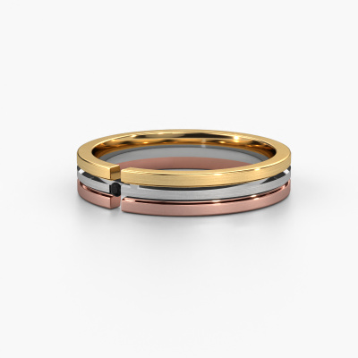 An extraordinary affordable white gold ladies wedding ring! The combination of the three different precious metals represents your unique love. Isn't that wonderful? Our goldsmith will create your ring in our own crafting studio. With a unique combination of pure craftsmanship of goldsmiths and the most modern techniques, we are able to customize your modern three tone wedding ring to perfection. This 3 colour WH0402L14AM wedding ring set with round black diamond is ±0.16 in wide and has a matte finish. Choosing a wedding ring is not done on a whim. In the end, you want a ring that completely matches your style and preferences. A reflection of your love and relationship. A ring to last a lifetime. A symbol of all that unites you. Creating your dream ring is what gets us excited. This is artfully done by hand in our own crafting studio, so we can create your ring to perfection. The most rewarding job in the world!Do you have specific wishes regarding your wedding ring, but are you having difficulties finding the design on our website? The be sure to contact our designers! For instance, we can make the band smaller or wider. Do you prefer a matte finish? We can do that! Engravings are a great way of personalizing your rings, and applicable on most designs. Or, if you have an idea of your own for your extraordinary wedding rings, contact us! Our designers are up for the challenge of designing the ring of your dreams!By combining our modern techniques with ancient crafting, we can design and customize the finest quality jewels with the utmost care for you at the best price. Our wedding rings are always priced 30% lower than those of other jewellers. We make wedding rings to order so we don't have to maintain a large stock.To make it easier for you, we offer a 30 day return policy. Check our terms and conditions.