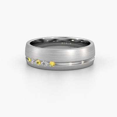 What a perfect combination of two different precious metals. They seem to reinforce each other in the traditional design of this ring! Our goldsmith would be honoured to create a unique ring for you, customized to your liking. Each ladies wedding ring we offer is artfully crafted by hand in our own artisan studio. That makes it possible for us to turn traditional into reality and helps create your own personal ring, customized to your style. This traditional WH0323L25AM ladies wedding ring is set with round yellow sapphire, is ±0.24 in wide and has a matte finish. Simply customize your gemstones and colours with our online tool. Our jewel designers will make a 3D drawing of your design, so you can see the result. Our goldsmiths will subsequently make your wedding ring by hand, according ancient craftsmanship. Our goal is to make the wedding ring you have in mind. A unique wedding ring to match your style completely!Do you have specific wishes regarding your wedding ring, but are you having difficulties finding the design on our website? The be sure to contact our designers! For instance, we can make the band smaller or wider. Do you prefer a matte finish? We can do that! Engravings are a great way of personalizing your rings, and applicable on most designs. Or, if you have an idea of your own for your extraordinary wedding rings, contact us! Our designers are up for the challenge of designing the ring of your dreams!By combining our modern techniques with ancient crafting, we can design and customize the finest quality jewels with the utmost care for you at the best price. Our wedding rings are always priced 30% lower than those of other jewellers. We make wedding rings to order so we don't have to maintain a large stock.To make it easier for you, we offer a 30 day return policy. Check our terms and conditions.