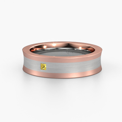 What a perfect combination of two different precious metals. They seem to reinforce each other in the fashionable design of this ring! Our goldsmith would be honoured to create a unique ring for you, customized to your liking. Each ladies wedding ring we offer is artfully crafted by hand in our own artisan studio. That makes it possible for us to turn fashionable into reality and helps create your own personal ring, customized to your style. This fashionable WH2238L2 ladies wedding ring is set with princess yellow sapphire, is ±0.24 in wide and has a matte finish. You can choose the combination of precious metals of your preference in our online tool. Anything goes! It is wise to browse through the characteristics of each different precious metal. For example, gold and silver are softer metals. Carat is determined by the amount of added extra metals. If the goldsmith doesn't add a lot, carat is higher and the wedding ring will be softer. If he adds more metals, the jewel has a lower amount of carat. A softer precious metal can still be used for your fashionable wedding ring! If you prefer a precious metal which will last a lifetime, we recommend platinum. This is the most solid and durable metal our goldsmith uses.Be inspired by our designs, and adjust this wedding ring to your own personal taste: wider or smaller, shiny or matte? No problem! Even if you have ideas of your own for special wedding rings, our jewellery designers are lined up to help you design the ring of your dreams. don't hesitate to contact us!Because we design and deliver our own wedding rings, we can offer you wedding rings at a price you won't find anywhere else. A ring is made to order, which helps prevent excess supplies, so we can make you a great price offer.To make it easier for you, we offer a 30 day return policy. Check our terms and conditions.