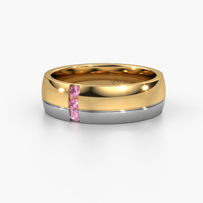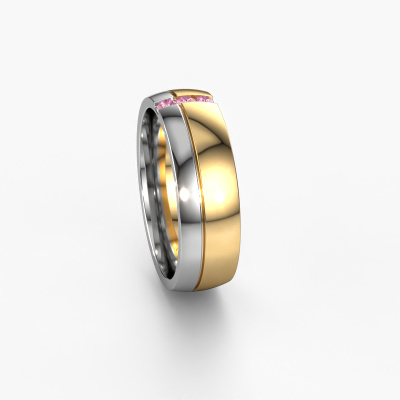 A unique two-tone gold ladies wedding ring, designed by you, and then artfully crafted by our goldsmith in our own artisan studio! A beautiful symbol, reflecting your love, which you carry with you for a lifetime! Each ring we offer is artfully forged by hand in our own crafting studio. This makes it possible for us to create you a ring which is customized to your liking, completely shiny your style. This modern WH0223L56A wedding ring is set with pink sapphire, is ±0.24 in wide and has a shiny finish. The jewel designer, member of a specialized team, will make a graphic 3D design of your wedding ring. If it pleases you, you can also order a ring dummy so you can try it on and see your ring before creation. Subsequently, our goldsmith will create your unique wedding ring with great care in our own crafting studio. A meticulous job, because both creating as well as finishing your ring requires a keen eye. And that is what makes our craft special. Your unique wedding ring is the result of true passionate craftsmanship!By the way, you can be inspired by this wedding ring and have it further adjusted to your taste. Do you prefer a smaller band or a wider one? Do you prefer a shiny ring or a matte one? Anything is possible. Also, if you have an idea of your own for extraordinary wedding rings, or if you have seen a beautiful set somewhere else that you really like and would like to have adjusted to your personal taste: no problem! don't hesitate to contact us. Our designers will gladly discuss your possibilities with you!After receiving your order, our goldsmiths will start the creative process of making your wedding rings. We don't keep stock. This is advantageous because these costs will not be passed on to you. Therefore, our quality wedding rings are always priced 30 percent lower than those of other jewellers.To make it easier for you, we offer a 30 day return policy. Check our terms and conditions.
