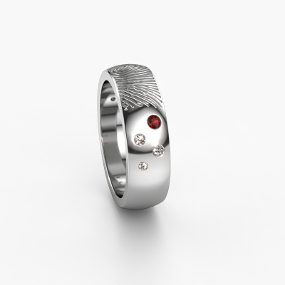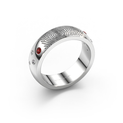 What could be more unique than a fingerprint? That makes this unisex wedding ring with garnet special. A personal fingerprint of your loved one, engraved tot the symbol of your everlasting love. Wouldn't it be lovely to slide this modern wedding ring around the finger of your partner on your wedding day? How does it work? First you order the wedding ring after customizing it to your liking. Once your order is placed, you send us an e-mail with the fingerprint you would like to use. For further instructions on how to make a fingerprint, check our database at the bottom of this page. This Minke wedding ring has an ±0.24 in width. After ordering your wedding ring, our goldsmith will start creating your wedding ring immediately. Did you know we use the latest modern techniques, combined with ancient craftsmanship? This helps to create a 3D design of your jewel. You can order a dummy ring, if you please. This way you can check if the wedding ring meets your standard. Then, our goldsmith, who strives for perfection, will create your ring in our own artisan studio completely by hand. We feel passionate creating a unique ring each time. One which is finished to perfection. In the end, you get a wedding ring which matches your wishes.By the way, you can be inspired by this wedding ring and have it further adjusted to your taste. Do you prefer a smaller band or a wider one? Do you prefer a shiny ring or a matte one? Anything is possible. Also, if you have an idea of your own for extraordinary wedding rings, or if you have seen a beautiful set somewhere else that you really like and would like to have adjusted to your personal taste: no problem! don't hesitate to contact us. Our designers will gladly discuss your possibilities with you!Because we design and deliver our own wedding rings, we can offer you wedding rings at a price you won't find anywhere else. A ring is made to order, which helps prevent excess supplies, so we can make you a great price offer.To make it easier for you, we offer a 30 day return policy. Check our terms and conditions.