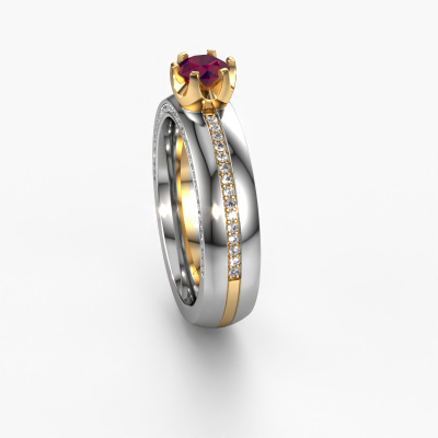 If you are looking for an exclusive, unique weddings ring with an exquisite look, this ring is perfect for you. Because it can be customized to your style, this weddings ring can be turned into a unique, exclusive piece of jewellery. This unique ladies weddings ring is a perfect combination of ancient craftsmanship, love, passion and the latest modern techniques. This unique WH0416L25E weddings ring is set with rhodolite 5 mm, is ±0.20 in wide and has a shiny finish. After designing your ring, our jewel designer will start working on it. He will make a graphic 3D design of your weddings ring. This can also be used to make a dummy ring. Simply order a dummy ring and see for yourself how your ring will turn out. Subsequently, our expert goldsmith will create your ring in our own artisan studio. We use eco-friendly gold, so you get a ring, we are proud of, which looks good inside and out. You can also send us your own gold. Because we create your ring by hand, we can use your own gold. Our goal is to create an exquisite sparkling weddings ring just as envisioned it!By the way, you can be inspired by this weddings ring and have it further adjusted to your taste. Do you prefer a smaller band or a wider one? Do you prefer a shiny ring or a matte one? Anything is possible. Also, if you have an idea of your own for extraordinary wedding rings, or if you have seen a beautiful set somewhere else that you really like and would like to have adjusted to your personal taste: no problem! don't hesitate to contact us. Our designers will gladly discuss your possibilities with you!After receiving your order, our goldsmiths will start the creative process of making your wedding rings. We don't keep stock. This is advantageous because these costs will not be passed on to you. Therefore, our quality wedding rings are always priced 30 percent lower than those of other jewellers.To make it easier for you, we offer a 30 day return policy. Check our terms and conditions.