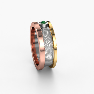 What could be more unique than a fingerprint? That makes this ladies wedding ring with emerald special. A personal fingerprint of your loved one, engraved tot the symbol of your everlasting love. Wouldn't it be lovely to slide this fantasy wedding ring around the finger of your partner on your wedding day? How does it work? First you order the wedding ring after customizing it to your liking. Once your order is placed, you send us an e-mail with the fingerprint you would like to use. For further instructions on how to make a fingerprint, check our database at the bottom of this page. This Francisca wedding ring has an ±0.28 in width. After ordering your wedding ring, our goldsmith will start creating your wedding ring immediately. Did you know we use the latest modern techniques, combined with ancient craftsmanship? This helps to create a 3D design of your jewel. You can order a dummy ring, if you please. This way you can check if the wedding ring meets your standard. Then, our goldsmith, who strives for perfection, will create your ring in our own artisan studio completely by hand. We feel passionate creating a unique ring each time. One which is finished to perfection. In the end, you get a wedding ring which matches your wishes.By the way, you can be inspired by this wedding ring and have it further adjusted to your taste. Do you prefer a smaller band or a wider one? Do you prefer a shiny ring or a matte one? Anything is possible. Also, if you have an idea of your own for extraordinary wedding rings, or if you have seen a beautiful set somewhere else that you really like and would like to have adjusted to your personal taste: no problem! don't hesitate to contact us. Our designers will gladly discuss your possibilities with you!After receiving your order, our goldsmiths will start the creative process of making your wedding rings. We don't keep stock. This is advantageous because these costs will not be passed on to you. Therefore, our quality wedding rings are always priced 30 percent lower than those of other jewellers.To make it easier for you, we offer a 30 day return policy. Check our terms and conditions.