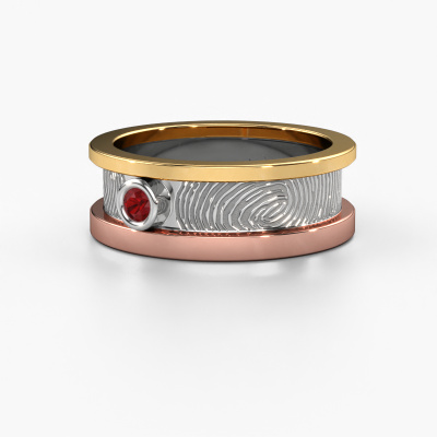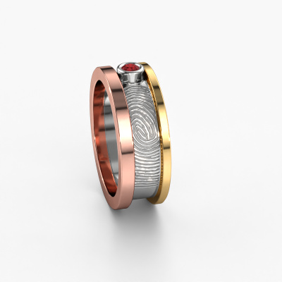 What could be more unique than a fingerprint? That makes this ladies wedding ring with ruby special. A personal fingerprint of your loved one, engraved tot the symbol of your everlasting love. Wouldn't it be lovely to slide this fantasy wedding ring around the finger of your partner on your wedding day? How does it work? First you order the wedding ring after customizing it to your liking. Once your order is placed, you send us an e-mail with the fingerprint you would like to use. For further instructions on how to make a fingerprint, check our database at the bottom of this page. This Francisca wedding ring has an ±0.28 in width. After ordering your wedding ring, our goldsmith will start creating your wedding ring immediately. Did you know we use the latest modern techniques, combined with ancient craftsmanship? This helps to create a 3D design of your jewel. You can order a dummy ring, if you please. This way you can check if the wedding ring meets your standard. Then, our goldsmith, who strives for perfection, will create your ring in our own artisan studio completely by hand. We feel passionate creating a unique ring each time. One which is finished to perfection. In the end, you get a wedding ring which matches your wishes.By the way, you can be inspired by this wedding ring and have it further adjusted to your taste. Do you prefer a smaller band or a wider one? Do you prefer a shiny ring or a matte one? Anything is possible. Also, if you have an idea of your own for extraordinary wedding rings, or if you have seen a beautiful set somewhere else that you really like and would like to have adjusted to your personal taste: no problem! don't hesitate to contact us. Our designers will gladly discuss your possibilities with you!After receiving your order, our goldsmiths will start the creative process of making your wedding rings. We don't keep stock. This is advantageous because these costs will not be passed on to you. Therefore, our quality wedding rings are always priced 30 percent lower than those of other jewellers.To make it easier for you, we offer a 30 day return policy. Check our terms and conditions.
