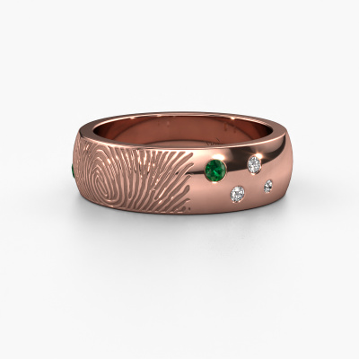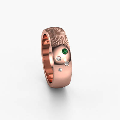 What could be more unique than a fingerprint? That makes this unisex wedding ring with emerald special. A personal fingerprint of your loved one, engraved tot the symbol of your everlasting love. Wouldn't it be lovely to slide this modern wedding ring around the finger of your partner on your wedding day? How does it work? First you order the wedding ring after customizing it to your liking. Once your order is placed, you send us an e-mail with the fingerprint you would like to use. For further instructions on how to make a fingerprint, check our database at the bottom of this page. This Minke wedding ring has an ±0.24 in width. After ordering your wedding ring, our goldsmith will start creating your wedding ring immediately. Did you know we use the latest modern techniques, combined with ancient craftsmanship? This helps to create a 3D design of your jewel. You can order a dummy ring, if you please. This way you can check if the wedding ring meets your standard. Then, our goldsmith, who strives for perfection, will create your ring in our own artisan studio completely by hand. We feel passionate creating a unique ring each time. One which is finished to perfection. In the end, you get a wedding ring which matches your wishes.By the way, you can be inspired by this wedding ring and have it further adjusted to your taste. Do you prefer a smaller band or a wider one? Do you prefer a shiny ring or a matte one? Anything is possible. Also, if you have an idea of your own for extraordinary wedding rings, or if you have seen a beautiful set somewhere else that you really like and would like to have adjusted to your personal taste: no problem! don't hesitate to contact us. Our designers will gladly discuss your possibilities with you!Because we design and deliver our own wedding rings, we can offer you wedding rings at a price you won't find anywhere else. A ring is made to order, which helps prevent excess supplies, so we can make you a great price offer.To make it easier for you, we offer a 30 day return policy. Check our terms and conditions.
