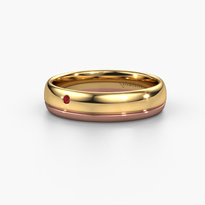 A unique two-tone gold ladies wedding ring, designed by you, and then artfully crafted by our goldsmith in our own artisan studio! A beautiful symbol, reflecting your love, which you carry with you for a lifetime! Each ring we offer is artfully forged by hand in our own crafting studio. This makes it possible for us to create you a ring which is customized to your liking, completely shiny your style. This traditional WH0301L35AP wedding ring is set with ruby, is ±0.20 in wide and has a shiny finish. You can choose the combination of precious metals of your preference in our online tool. Anything goes! It is wise to browse through the characteristics of each different precious metal. For example, gold and silver are softer metals. Carat is determined by the amount of added extra metals. If the goldsmith doesn't add a lot, carat is higher and the wedding ring will be softer. If he adds more metals, the jewel has a lower amount of carat. A softer precious metal can still be used for your traditional wedding ring! If you prefer a precious metal which will last a lifetime, we recommend platinum. This is the most solid and durable metal our goldsmith uses.Do you have special preferences regarding your wedding ring? For instance, a smaller or a wider band? Or perhaps a shiny or a matte ring? There are numerous variations possible. You can always discuss the possibilities with our jewellery designers. If you have certain wedding rings in mind, our designers will gladly help by drawing the rings of your dreams. Be sure to contact us!After receiving your order, our goldsmiths will start the creative process of making your wedding rings. We don't keep stock. This is advantageous because these costs will not be passed on to you. Therefore, our quality wedding rings are always priced 30 percent lower than those of other jewellers.To make it easier for you, we offer a 30 day return policy. Check our terms and conditions.