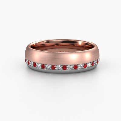 This luxury ladies wedding ring is a melting pot of ancient craftsmanship, love, passion and the latest techniques. It requires a keen eye, patience and a skilful hand to create this rose gold wedding ring to perfection. And perfection is what our goldsmiths strive for! This way, you create an exclusive ring, which is customized to your liking and made by hand in our own artisan studio. This luxury WH0303L36BMP wedding ring is set with ruby 1.3 mm, is ±0.24 in wide and has a mat/shiny finish. You can choose the combination of precious metals of your preference in our online tool. Anything goes! It is wise to browse through the characteristics of each different precious metal. For example, gold and silver are softer metals. Carat is determined by the amount of added extra metals. If the goldsmith doesn't add a lot, carat is higher and the wedding ring will be softer. If he adds more metals, the jewel has a lower amount of carat. A softer precious metal can still be used for your luxury wedding ring! If you prefer a precious metal which will last a lifetime, we recommend platinum. This is the most solid and durable metal our goldsmith uses.Do you have specific wishes? Like a shiny ring, or a matte one? A wider band, or a smaller one? The possibilities of this wedding ring are endless. Be sure to contact our designers to adjust your ring to your personal taste. Did you see a ring somewhere, or do you have some special ideas of your own? Then don't hesitate to contact our designers and discuss your ideas for your own set of beautiful wedding rings. We are up for the challenge of creating the ring exactly the way you want it!After receiving your order, our goldsmiths will start the creative process of making your wedding rings. We don't keep stock. This is advantageous because these costs will not be passed on to you. Therefore, our quality wedding rings are always priced 30 percent lower than those of other jewellers.To make it easier for you, we offer a 30 day return policy. Check our terms and conditions.