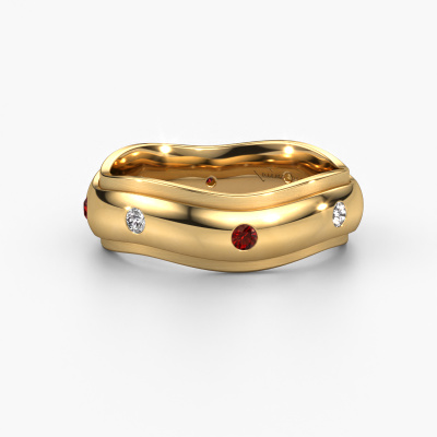 What a perfect combination of two different precious metals. They seem to reinforce each other in the modern design of this ring! Our goldsmith would be honoured to create a unique ring for you, customized to your liking. Each ladies wedding ring we offer is artfully crafted by hand in our own artisan studio. That makes it possible for us to turn modern into reality and helps create your own personal ring, customized to your style. This modern WH2051L26DP ladies wedding ring is set with round garnet, is ±0.24 in wide and has a mat/shiny finish.