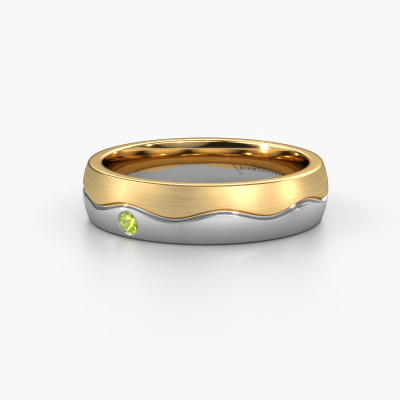 What a perfect combination of two different precious metals. They seem to reinforce each other in the fantasy design of this ring! Our goldsmith would be honoured to create a unique ring for you, customized to your liking. Each ladies wedding ring we offer is artfully crafted by hand in our own artisan studio. That makes it possible for us to turn fantasy into reality and helps create your own personal ring, customized to your style. This fantasy WH0701L25APM ladies wedding ring is set with round peridot, is ±0.20 in wide and has a mat/shiny finish. Simply customize your gemstones and colours with our online tool. Our jewel designers will make a 3D drawing of your design, so you can see the result. Our goldsmiths will subsequently make your wedding ring by hand, according ancient craftsmanship. Our goal is to make the wedding ring you have in mind. A unique wedding ring to match your style completely!Do you have special preferences regarding your wedding ring? For instance, a smaller or a wider band? Or perhaps a shiny or a matte ring? There are numerous variations possible. You can always discuss the possibilities with our jewellery designers. If you have certain wedding rings in mind, our designers will gladly help by drawing the rings of your dreams. Be sure to contact us!By combining our modern techniques with ancient crafting, we can design and customize the finest quality jewels with the utmost care for you at the best price. Our wedding rings are always priced 30% lower than those of other jewellers. We make wedding rings to order so we don't have to maintain a large stock.To make it easier for you, we offer a 30 day return policy. Check our terms and conditions.