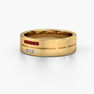 What a perfect combination of two different precious metals. They seem to reinforce each other in the modern design of this ring! Our goldsmith would be honoured to create a unique ring for you, customized to your liking. Each ladies wedding ring we offer is artfully crafted by hand in our own artisan studio. That makes it possible for us to turn modern into reality and helps create your own personal ring, customized to your style. This modern WH0207L16AP ladies wedding ring is set with round ruby, is ±0.24 in wide and has a shiny finish.