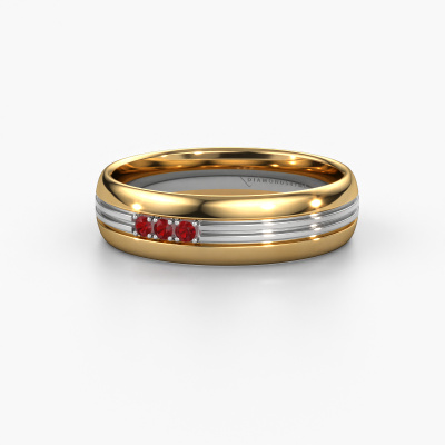 What a perfect combination of two different precious metals. They seem to reinforce each other in the modern design of this ring! Our goldsmith would be honoured to create a unique ring for you, customized to your liking. Each ladies wedding ring we offer is artfully crafted by hand in our own artisan studio. That makes it possible for us to turn modern into reality and helps create your own personal ring, customized to your style. This modern WH0405L35X ladies wedding ring is set with round ruby, is ±0.20 in wide and has a shiny finish. The jewel designer, member of a specialized team, will make a graphic 3D design of your wedding ring. If it pleases you, you can also order a ring dummy so you can try it on and see your ring before creation. Subsequently, our goldsmith will create your unique wedding ring with great care in our own crafting studio. A meticulous job, because both creating as well as finishing your ring requires a keen eye. And that is what makes our craft special. Your unique wedding ring is the result of true passionate craftsmanship!By the way, you can be inspired by this wedding ring and have it further adjusted to your taste. Do you prefer a smaller band or a wider one? Do you prefer a shiny ring or a matte one? Anything is possible. Also, if you have an idea of your own for extraordinary wedding rings, or if you have seen a beautiful set somewhere else that you really like and would like to have adjusted to your personal taste: no problem! don't hesitate to contact us. Our designers will gladly discuss your possibilities with you!After receiving your order, our goldsmiths will start the creative process of making your wedding rings. We don't keep stock. This is advantageous because these costs will not be passed on to you. Therefore, our quality wedding rings are always priced 30 percent lower than those of other jewellers.To make it easier for you, we offer a 30 day return policy. Check our terms and conditions.