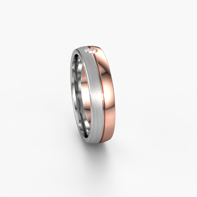 What a perfect combination of two different precious metals. They seem to reinforce each other in the modern design of this ring! Our goldsmith would be honoured to create a unique ring for you, customized to your liking. Each ladies wedding ring we offer is artfully crafted by hand in our own artisan studio. That makes it possible for us to turn modern into reality and helps create your own personal ring, customized to your style. This modern WH0201L25APM ladies wedding ring is set with round morganite champagne, is ±0.20 in wide and has a mat/shiny finish.