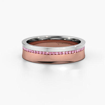 What a perfect combination of two different precious metals. They seem to reinforce each other in the modern design of this ring! Our goldsmith would be honoured to create a unique ring for you, customized to your liking. Each ladies wedding ring we offer is artfully crafted by hand in our own artisan studio. That makes it possible for us to turn modern into reality and helps create your own personal ring, customized to your style. This modern WH6090L55A ladies wedding ring is set with round pink sapphire, is ±0.20 in wide and has a shiny finish. Simply customize your gemstones and colours with our online tool. Our jewel designers will make a 3D drawing of your design, so you can see the result. Our goldsmiths will subsequently make your wedding ring by hand, according ancient craftsmanship. Our goal is to make the wedding ring you have in mind. A unique wedding ring to match your style completely!This wedding ring can also serve as a source of inspiration. Would you like the ring to have a matte or shiny finish (at no additional cost), or would you prefer it to be wider or narrower? Anything is possible. Because there are countless variations, we can’t show everything on our website. Do you have an idea for beautiful wedding rings, or have you seen a stunning set of wedding rings elsewhere? Feel free to contact us; our designers are ready to assist you.After receiving your order, our goldsmiths will start the creative process of making your wedding rings. We don't keep stock. This is advantageous because these costs will not be passed on to you. Therefore, our quality wedding rings are always priced 30 percent lower than those of other jewellers.To make it easier for you, we offer a 30 day return policy. Check our terms and conditions.