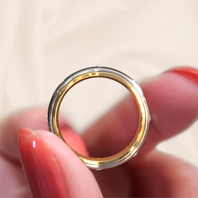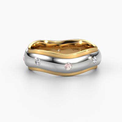 What a perfect combination of two different precious metals. They seem to reinforce each other in the modern design of this ring! Our goldsmith would be honoured to create a unique ring for you, customized to your liking. Each ladies wedding ring we offer is artfully crafted by hand in our own artisan studio. That makes it possible for us to turn modern into reality and helps create your own personal ring, customized to your style. This modern WH2051L26DP ladies wedding ring is set with round morganite champagne, is ±0.24 in wide and has a mat/shiny finish.