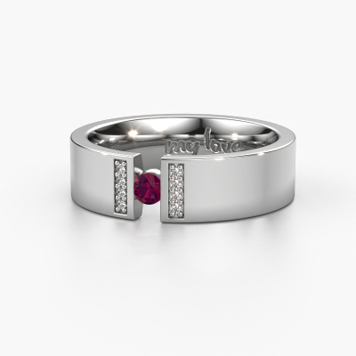 A unique wedding ring with rhodolite! What makes this ladies wedding ring WH2096L16C special, is that you can have it engraved with a special text, which has meaning to you. A word, a short phrase or part of the lyrics to a song. Whichever text is most meaningful to you. Memorialize it as an exquisite engravement on this modern wedding ring. This own Text ladies wedding ring has an ±0.24 in width. Simply customize your gemstones and colours with our online tool. Our jewel designers will make a 3D drawing of your design, so you can see the result. Our goldsmiths will subsequently make your wedding ring by hand, according ancient craftsmanship. Our goal is to make the wedding ring you have in mind. A unique wedding ring to match your style completely!This wedding ring can also serve as a source of inspiration. Would you like the ring to have a matte or shiny finish (at no additional cost), or would you prefer it to be wider or narrower? Anything is possible. Because there are countless variations, we can’t show everything on our website. Do you have an idea for beautiful wedding rings, or have you seen a stunning set of wedding rings elsewhere? Feel free to contact us; our designers are ready to assist you.After receiving your order, our goldsmiths will start the creative process of making your wedding rings. We don't keep stock. This is advantageous because these costs will not be passed on to you. Therefore, our quality wedding rings are always priced 30 percent lower than those of other jewellers.To make it easier for you, we offer a 30 day return policy. Check our terms and conditions.