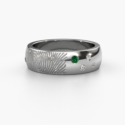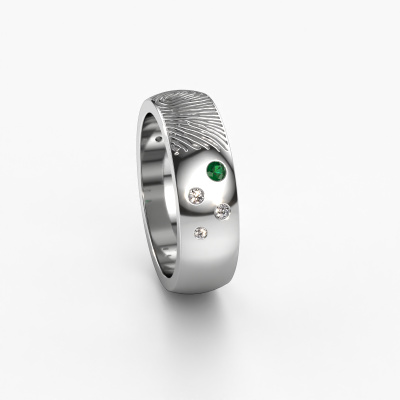 What could be more unique than a fingerprint? That makes this unisex wedding ring with emerald special. A personal fingerprint of your loved one, engraved tot the symbol of your everlasting love. Wouldn't it be lovely to slide this modern wedding ring around the finger of your partner on your wedding day? How does it work? First you order the wedding ring after customizing it to your liking. Once your order is placed, you send us an e-mail with the fingerprint you would like to use. For further instructions on how to make a fingerprint, check our database at the bottom of this page. This Minke wedding ring has an ±0.24 in width. After ordering your wedding ring, our goldsmith will start creating your wedding ring immediately. Did you know we use the latest modern techniques, combined with ancient craftsmanship? This helps to create a 3D design of your jewel. You can order a dummy ring, if you please. This way you can check if the wedding ring meets your standard. Then, our goldsmith, who strives for perfection, will create your ring in our own artisan studio completely by hand. We feel passionate creating a unique ring each time. One which is finished to perfection. In the end, you get a wedding ring which matches your wishes.By the way, you can be inspired by this wedding ring and have it further adjusted to your taste. Do you prefer a smaller band or a wider one? Do you prefer a shiny ring or a matte one? Anything is possible. Also, if you have an idea of your own for extraordinary wedding rings, or if you have seen a beautiful set somewhere else that you really like and would like to have adjusted to your personal taste: no problem! don't hesitate to contact us. Our designers will gladly discuss your possibilities with you!Because we design and deliver our own wedding rings, we can offer you wedding rings at a price you won't find anywhere else. A ring is made to order, which helps prevent excess supplies, so we can make you a great price offer.To make it easier for you, we offer a 30 day return policy. Check our terms and conditions.