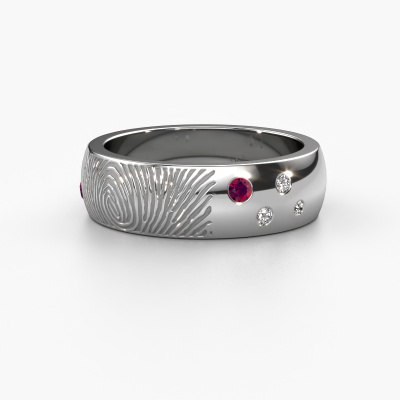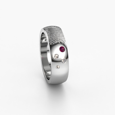 What could be more unique than a fingerprint? That makes this unisex wedding ring with rhodolite special. A personal fingerprint of your loved one, engraved tot the symbol of your everlasting love. Wouldn't it be lovely to slide this modern wedding ring around the finger of your partner on your wedding day? How does it work? First you order the wedding ring after customizing it to your liking. Once your order is placed, you send us an e-mail with the fingerprint you would like to use. For further instructions on how to make a fingerprint, check our database at the bottom of this page. This Minke wedding ring has an ±0.24 in width. After ordering your wedding ring, our goldsmith will start creating your wedding ring immediately. Did you know we use the latest modern techniques, combined with ancient craftsmanship? This helps to create a 3D design of your jewel. You can order a dummy ring, if you please. This way you can check if the wedding ring meets your standard. Then, our goldsmith, who strives for perfection, will create your ring in our own artisan studio completely by hand. We feel passionate creating a unique ring each time. One which is finished to perfection. In the end, you get a wedding ring which matches your wishes.By the way, you can be inspired by this wedding ring and have it further adjusted to your taste. Do you prefer a smaller band or a wider one? Do you prefer a shiny ring or a matte one? Anything is possible. Also, if you have an idea of your own for extraordinary wedding rings, or if you have seen a beautiful set somewhere else that you really like and would like to have adjusted to your personal taste: no problem! don't hesitate to contact us. Our designers will gladly discuss your possibilities with you!Because we design and deliver our own wedding rings, we can offer you wedding rings at a price you won't find anywhere else. A ring is made to order, which helps prevent excess supplies, so we can make you a great price offer.To make it easier for you, we offer a 30 day return policy. Check our terms and conditions.