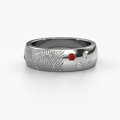 What could be more unique than a fingerprint? That makes this unisex wedding ring with ruby special. A personal fingerprint of your loved one, engraved tot the symbol of your everlasting love. Wouldn't it be lovely to slide this modern wedding ring around the finger of your partner on your wedding day? How does it work? First you order the wedding ring after customizing it to your liking. Once your order is placed, you send us an e-mail with the fingerprint you would like to use. For further instructions on how to make a fingerprint, check our database at the bottom of this page. This Minke wedding ring has an ±0.24 in width. After ordering your wedding ring, our goldsmith will start creating your wedding ring immediately. Did you know we use the latest modern techniques, combined with ancient craftsmanship? This helps to create a 3D design of your jewel. You can order a dummy ring, if you please. This way you can check if the wedding ring meets your standard. Then, our goldsmith, who strives for perfection, will create your ring in our own artisan studio completely by hand. We feel passionate creating a unique ring each time. One which is finished to perfection. In the end, you get a wedding ring which matches your wishes.By the way, you can be inspired by this wedding ring and have it further adjusted to your taste. Do you prefer a smaller band or a wider one? Do you prefer a shiny ring or a matte one? Anything is possible. Also, if you have an idea of your own for extraordinary wedding rings, or if you have seen a beautiful set somewhere else that you really like and would like to have adjusted to your personal taste: no problem! don't hesitate to contact us. Our designers will gladly discuss your possibilities with you!Because we design and deliver our own wedding rings, we can offer you wedding rings at a price you won't find anywhere else. A ring is made to order, which helps prevent excess supplies, so we can make you a great price offer.To make it easier for you, we offer a 30 day return policy. Check our terms and conditions.