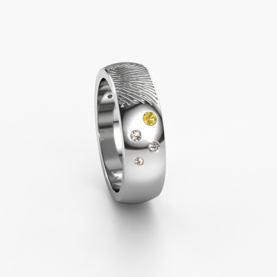 What could be more unique than a fingerprint? That makes this unisex wedding ring with yellow sapphire special. A personal fingerprint of your loved one, engraved tot the symbol of your everlasting love. Wouldn't it be lovely to slide this modern wedding ring around the finger of your partner on your wedding day? How does it work? First you order the wedding ring after customizing it to your liking. Once your order is placed, you send us an e-mail with the fingerprint you would like to use. For further instructions on how to make a fingerprint, check our database at the bottom of this page. This Minke wedding ring has an ±0.24 in width. After ordering your wedding ring, our goldsmith will start creating your wedding ring immediately. Did you know we use the latest modern techniques, combined with ancient craftsmanship? This helps to create a 3D design of your jewel. You can order a dummy ring, if you please. This way you can check if the wedding ring meets your standard. Then, our goldsmith, who strives for perfection, will create your ring in our own artisan studio completely by hand. We feel passionate creating a unique ring each time. One which is finished to perfection. In the end, you get a wedding ring which matches your wishes.By the way, you can be inspired by this wedding ring and have it further adjusted to your taste. Do you prefer a smaller band or a wider one? Do you prefer a shiny ring or a matte one? Anything is possible. Also, if you have an idea of your own for extraordinary wedding rings, or if you have seen a beautiful set somewhere else that you really like and would like to have adjusted to your personal taste: no problem! don't hesitate to contact us. Our designers will gladly discuss your possibilities with you!Because we design and deliver our own wedding rings, we can offer you wedding rings at a price you won't find anywhere else. A ring is made to order, which helps prevent excess supplies, so we can make you a great price offer.To make it easier for you, we offer a 30 day return policy. Check our terms and conditions.