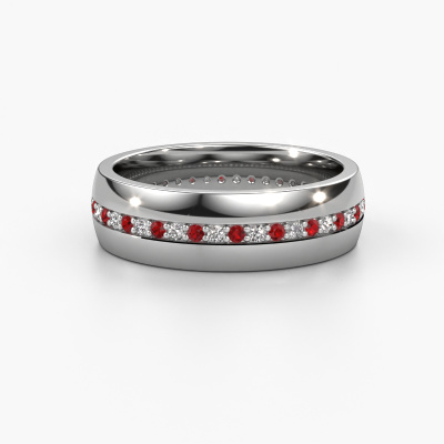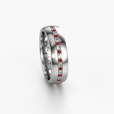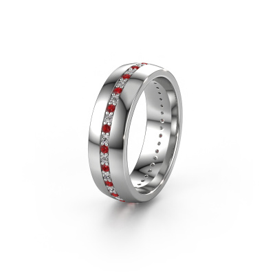 Did you know the Eternity weddings ring not only looks good, but that this weddings ring also has its own beautiful symbolical meaning? The Eternity weddings ring, with perfectly aligned smaller sized gemstones, represents your eternal love. Because the ring is pave set with gemstones, it appears to have no beginning nor end. Beautiful, wouldn't you agree? This wide WH0103L26BP ladies weddings ring has a width of ±0.24 in and is set with ruby 1.3 mm. After designing your ring, our jewel designer will start working on it. He will make a graphic 3D design of your weddings ring. This can also be used to make a dummy ring. Simply order a dummy ring and see for yourself how your ring will turn out. Subsequently, our expert goldsmith will create your ring in our own artisan studio. We use eco-friendly gold, so you get a ring, we are proud of, which looks good inside and out. You can also send us your own gold. Because we create your ring by hand, we can use your own gold. Our goal is to create an exquisite sparkling weddings ring just as envisioned it!Do you have specific wishes? Like a shiny ring, or a matte one? A wider band, or a smaller one? The possibilities of this weddings ring are endless. Be sure to contact our designers to adjust your ring to your personal taste. Did you see a ring somewhere, or do you have some special ideas of your own? Then don't hesitate to contact our designers and discuss your ideas for your own set of beautiful wedding rings. We are up for the challenge of creating the ring exactly the way you want it!After receiving your order, our goldsmiths will start the creative process of making your wedding rings. We don't keep stock. This is advantageous because these costs will not be passed on to you. Therefore, our quality wedding rings are always priced 30 percent lower than those of other jewellers.To make it easier for you, we offer a 30 day return policy. Check our terms and conditions.