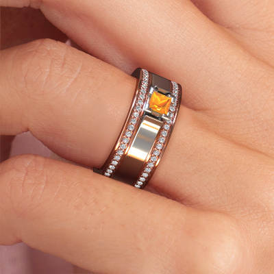 A truly stylish 14 Carat exclusive wedding ring! This exquisite ladies wedding ring, as shown above, is set with princess citrin. Our goldsmiths make each rose gold wedding ring by hand in our own artisan studio and because of that, the citrin are set with the utmost precision. This causes light to reflect evenly from every angle of the citrin. The width of this exclusive WH2121L wedding ring is ±0.31 in and the finish is shiny. Choosing a wedding ring is not done on a whim. In the end, you want a ring that completely matches your style and preferences. A reflection of your love and relationship. A ring to last a lifetime. A symbol of all that unites you. Creating your dream ring is what gets us excited. This is artfully done by hand in our own crafting studio, so we can create your ring to perfection. The most rewarding job in the world!Do you have specific wishes? Like a shiny ring, or a matte one? A wider band, or a smaller one? The possibilities of this wedding ring are endless. Be sure to contact our designers to adjust your ring to your personal taste. Did you see a ring somewhere, or do you have some special ideas of your own? Then don't hesitate to contact our designers and discuss your ideas for your own set of beautiful wedding rings. We are up for the challenge of creating the ring exactly the way you want it!After receiving your order, our goldsmiths will start the creative process of making your wedding rings in our own crafting studio. We don't keep stock. This is advantageous because these costs will not be passed on to you. Therefore, we can offer the finest quality jewellery at exceptionally low prices.To make it easier for you, we offer a 30 day return policy. Check our terms and conditions.